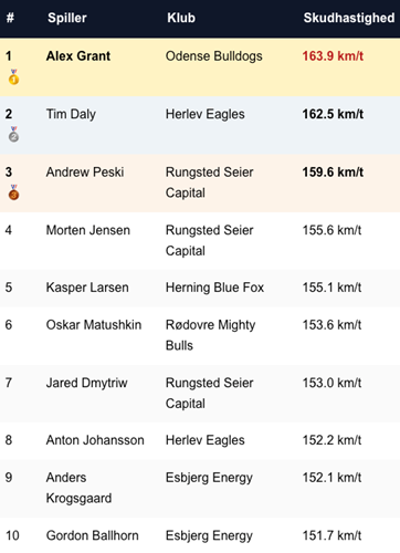 163,9 km/t. Det er ligaens hårdeste slagskud i slutspillet, og det er Alex Grant, som står bag.